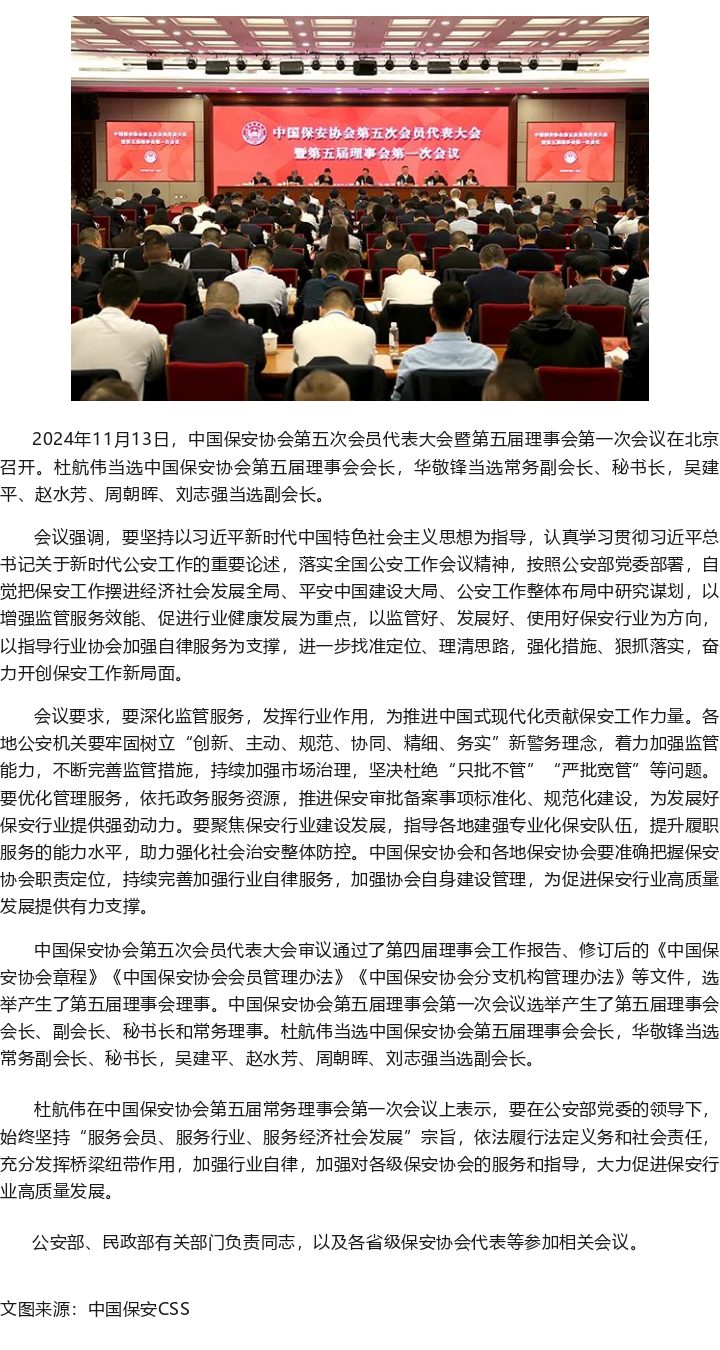 中国保安协会第五次会员代表大会暨第五届理事会第一次会议在京召开选举产生新一届协会领导