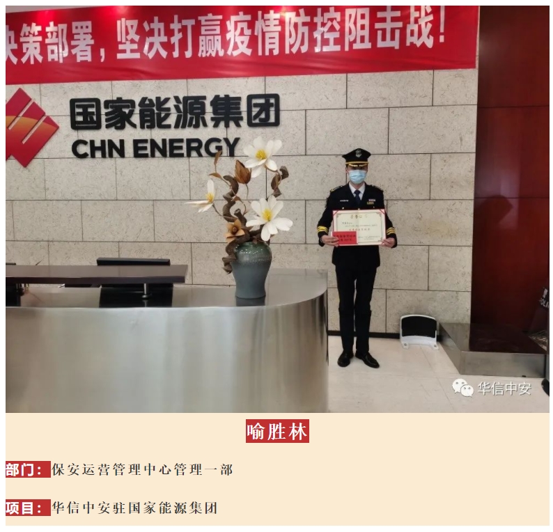 喻胜林,政治过硬、爱岗敬业、工作努力、具有较强的事业心和责任心。工作中以身作则,高标准严要求,严格执行公司各项规章制度,起到模范带头作用。生活中他总是对新入职的队员给予主动关心,主动帮助。疫情期间,他肩负起了东门人员测温登记工作,在琐碎繁杂的工作中,喻胜林凭借着对职业的无限赤诚和执著追求,在平凡的岗位上履行着自己的神圣职责,保护着客户单位的财产安全。经保安运营管理中心党总支和管理一部党支部按照程序要求组织评比、推荐,集团党委研究决定,授予喻胜林2021年第三季度优秀保安员标兵。