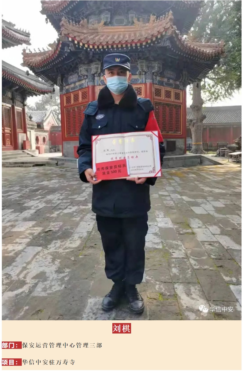 刘棋,工作中他始终以公司"忠诚尽责、厚德守信"的核心价值观为准则,在岗位上兢兢业业,认真学习岗位制度和工作流程,高标准完成各项工作任务。在门岗的工作岗位上,刘棋认真对待每一位前来办事的人员,有礼有节,微笑服务。自新型冠状病毒疫情爆发以来,门岗任务空前严峻,刘棋严格检查进入的人员及车辆,并核对车证、工作证,测量体温、监督到访人员做好健康宝登记,一丝不苟地落实好各项要求,确保每位进入人员都符合防疫规定,不放进任何一位可疑人员。以高度的事业心和责任感,为公司树立良好的形象。经保安运营管理中心党总支和管理三部党支部按照程序要求组织评比、推荐,集团党委研究决定,授予刘棋2021年第三季度优秀保安员标兵。