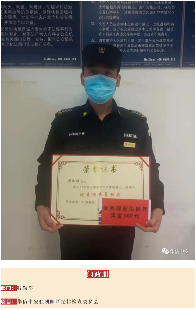 闫政朋自入职以来,踏实肯干,勤恳好学,为人处世谦和,与人交往热情,在工作中,努力学习,能够迅速掌握胜任各个岗位的专业技能。积极配合班队长工作,能够严格按照甲方的规章制度落实工作任务要求。在其它临时勤务中,积极主动加班加点,有高度的责任心和保密意识。经保安运营管理中心党总支和特勤部按照程序要求组织评比、推荐,集团党委研究决定,授予闫政朋2021年第三季度优秀保安员标兵。