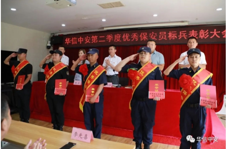 一部百年党史,既是一部感天动地的史诗,也是一首矢志不渝践行初心使命的赞歌。在庆祝中国共产党成立100周年大会上,习近平总书记精辟概括了伟大建党精神的深刻内涵,指出"一百年前,中国共产党的先驱们创建了中国共产党,形成了坚持真理、坚守理想,践行初心、担当使命,不怕牺牲、英勇斗争,对党忠诚、不负人民的伟大建党精神,这是中国共产党的精神之源。" "践行初心、担当使命",这是对建党精神传承,也是一以贯之的情怀担当。为引导鼓励保安员全力投入常态化疫情防控和维护社会稳定各项工作之中,展现首都保安新时代热爱祖国、勇于担当、无私奉献的精神风貌,进一步激发保安员践行初心、担当使命,华信中安党委开展一系列创先争优活动。文明先锋岗活动,是乐鱼体育创先争优活动的一项重要内容,旨在激发全体保安员创先争优的工作劲头和敬业履职的奉献精神,使各类先进典型在工作岗位上充分发挥示范引领作用,在全公司营造岗位争先进、业务创一流、个人争先锋的良好局面。促进队伍正规化、标准化、专业化建设,持续为客户提供高效优质的保安服务。2021年7月15日下午,乐鱼体育召开了第二季度优秀保安员标兵表彰大会。乐鱼体育党委书记林永强号召全体保安战士要向先张耀俊、张艳国、董星坤、郝成、武志强、李柏林、李旭飞、许亚赛、程双、马记等10名优秀保安员标兵学习,学习他们"忠于职守、爱岗敬业"的工作态度、学习他们"立足岗位、建功立业"的思想品德,扎扎实实地做好自己的本职工作。