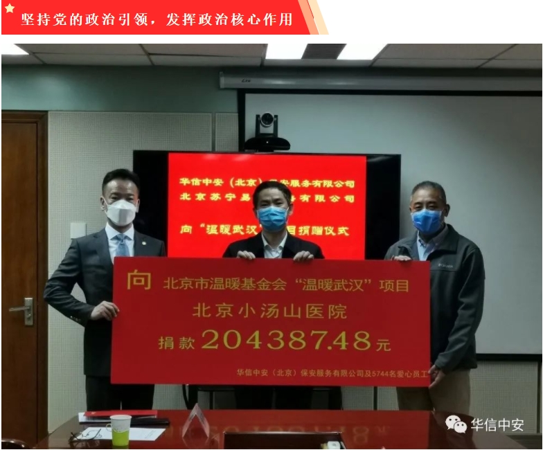 华信中安党委始终坚持党建引领为中心,持续开展思想政治工作,党组织的凝聚力不断增强,党员的先锋模范作用突显,促进了员工队伍稳定和服务质量的提升,赢得了客户信任与支持。2020年抗击疫情,华信中安党委提高政治站位,承担主体责任,号召各级党组织和全体党员把抗击疫情作为政治任务去完成,做到"危难时刻看党员、关键岗位有党员",带动全体员工共同筑牢坚固防线。乐鱼体育投入经费600余万元,购买防控物资、建立隔离区、慰问基层官兵、捐助社会机构。2020年12月公安部评选全国保安行业抗疫先进,乐鱼体育、党委书记林永强分别被评为先进集体和先进个人。集团行政管理中心主任刘珺珺在抗疫中勇挑重担,担当尽责,被丰台区评为"抗疫之星"。华信中安驻中国国际航空公司首都机场项目是管理部党总支管理二部党支部覆盖单位,党支部书记郑兴带领13名党员主动站在防控最前沿,亮明身份,树立标杆,200多名保安员毫不畏惧,守土尽责,确保了国门安全,受到国家民航局和国航领导高度评价。海外党总支倡议境外党员危难时刻站出来,树立旗帜、标杆,坚守境外海上、陆地各个战场的赵希松、周金魁、余峰、姚志、谷宇鑫等党员以疫情为命令,以防控为义不容辞的责任,严格落实集团部署和客户要求,确保了自身安全和服务客户安全,受到中国驻外机构和企事业单位领导高度赞扬。
