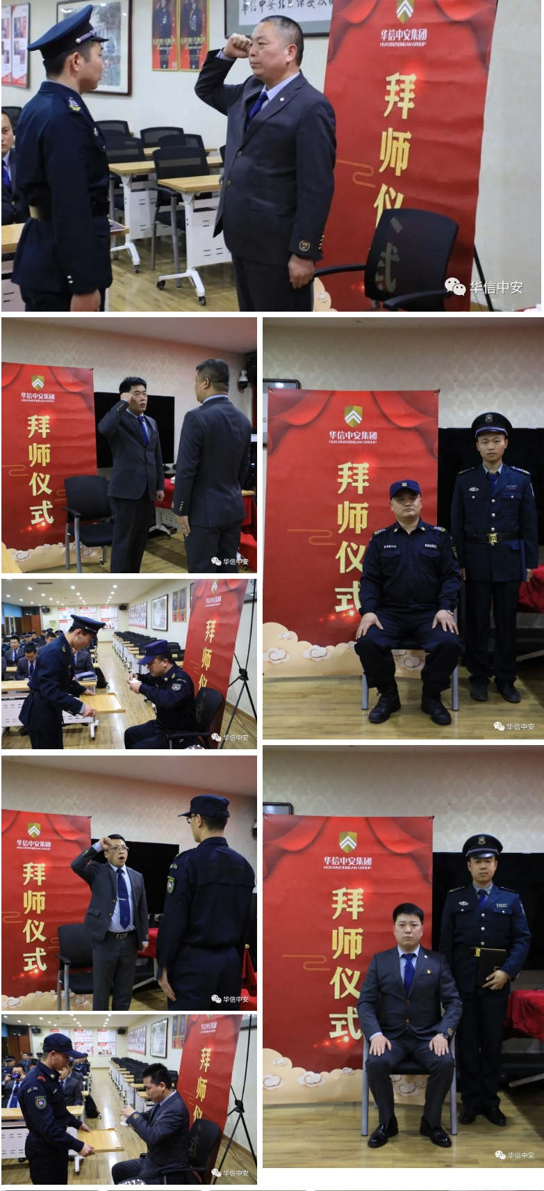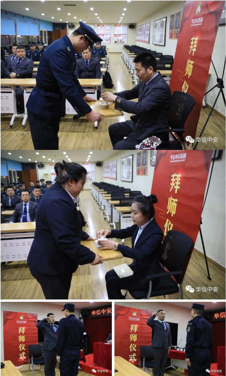 简短而有序的仪式后,参会教导员希望此次受聘的师傅们履行好这项光荣使命,肩负起公司交予的重任,严于律己,做好表率,把自己多年工作中好的经验作风倾囊相授,与学徒荣辱与共,帮助他们迅速融入团队,快速成长,生活上像亲人一样关心呵护徒弟,让徒弟感受公司大家庭的温暖;希望所有徒弟谨记师傅教诲,以积极进取的态度,虚心学习师傅身上的高尚师德、吃苦耐劳的精神和扎实精湛的业务技能,多听、多问、多思、多做,牢记使命,争取早日成为专业的保安人和优秀的华信中安人。