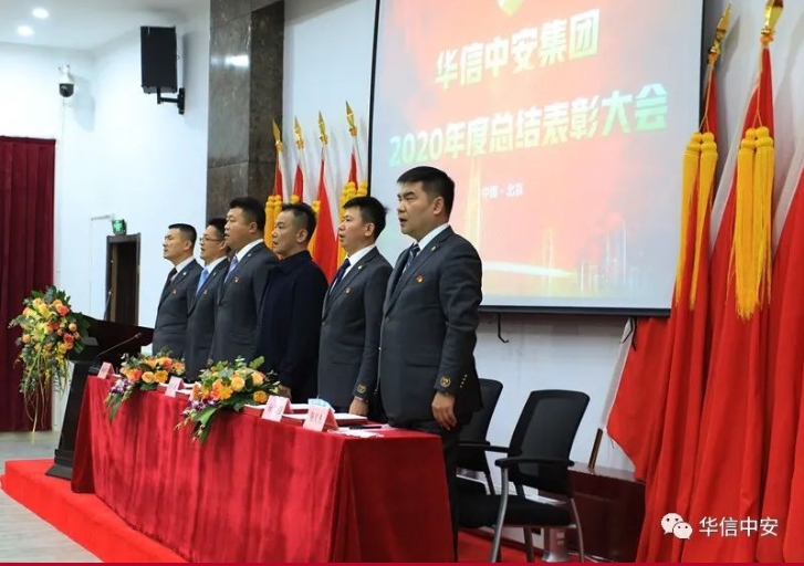 在全体参会人员奏唱国歌仪式结束之后,殷卫宏董事长上台总结2020年集团各项工作,展望2021年新的发展征程。讲话中殷卫宏董事长指出:过去的一年,华信中安筑牢疫情防控防火墙,实现了"零感染、零传播";抓住经营发展主线,安保业务实现稳步增长;重点关注服务品质,客户满意度持续提升;抓住科技创新机遇,不断提升核心竞争力;抓好海外安保布局,打造全球综合风险大数据平台;坚持党建示范引领,确保企业健康可持续发展。2021年面对日趋复杂的市场环境和国际形势,我们要居安思危,提前谋划,根据安保行业发展特点,不断优化集团业务布局,为集团占领行业制高点和抵御系统性风险奠定基础。新的一年,华信中安将继续抓好精细管理,为客户提供优质、高效的安保服务;抓好企业发展,实现保安服务、教育培训、智能科技三大业务快速增长;抓好组织建设,充分发挥组织政治优势,充分发挥共产党员的先锋模范作用,促进工会、团委工作;抓好安全生产,做好常态化疫情防控工作。