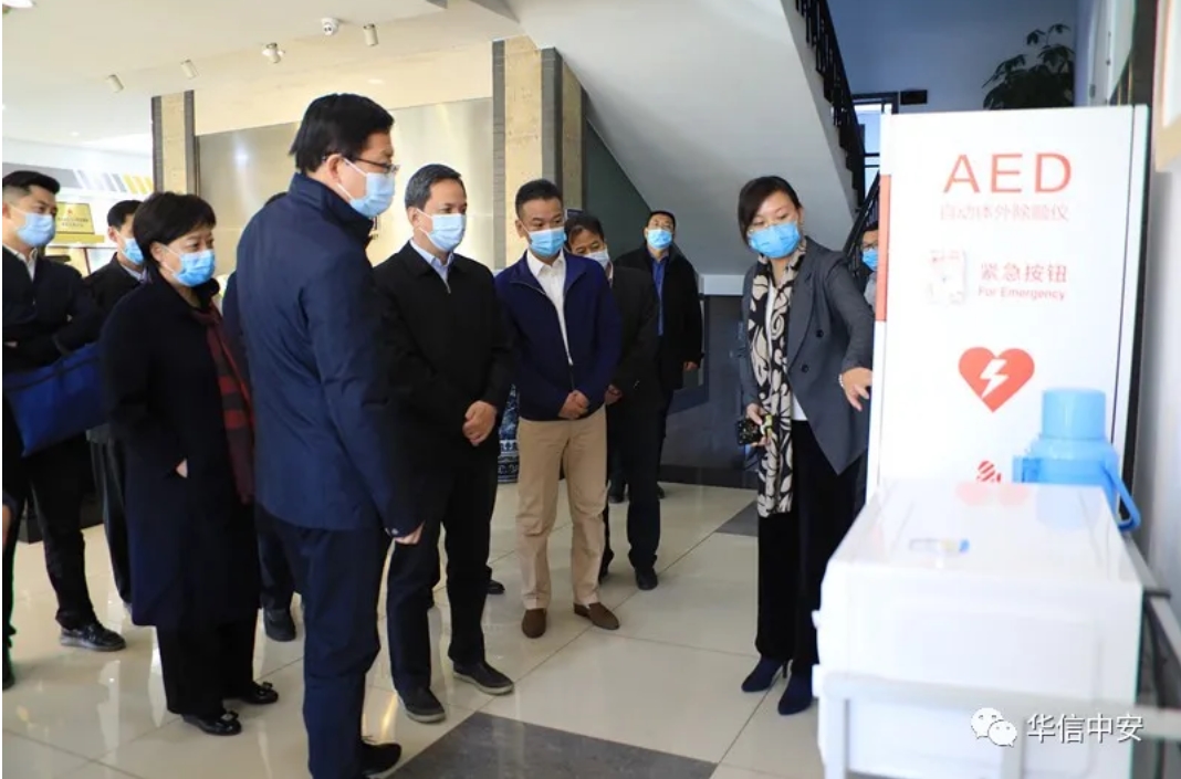 随后工作人员向北京市副市长卢彦、北京市政府副秘书长陈蓓一行演示了自动体外除颤仪(AED)的具体使用过程。随着经济社会的快速发展,人们的工作和生活压力不断加大,心脑血管等疾病也在时刻威胁着人们的生命安全和身体健康。AED是一种能够自动识别异常心律并给予电击除颤的急救设备,抢救心跳骤停患者的成功率远高于徒手心肺复苏。其最大特点是使用者无需具备专业背景,在接受一定时间的培训后,操作者即可使用。有统计显示,在现实生活中绝大多数的心源性猝死都发生在医院以外的公共场所或家庭,当专业急救人员赶到现场时,往往错过了最佳抢救时间,如果在意外发生的"黄金四分钟"内实施应急救护,并得到AED的辅助,将极大提高心脏骤停和呼吸停止患者抢救的成功率。因此,在公共场所安装AED,开展群众性应急救护培训,提高群众自救互救技能,对于提高急救成功率,保障人民群众生命安全具有十分重要的意义。观看过程中,卢彦副市长对设备的使用情况,培训工作开展情况等相关问题与工作人员进行了深入讨论,并希望在广泛设置AED设备的同时,积极做好AED管理、维护以及培训普及工作,让公共场所每一台AED成为普及急救知识的培训点、宣传站,不断提高民众的急救意识,真正让"救命神器"发挥作用,切实为保护民众生命和健康做出应有的贡献。