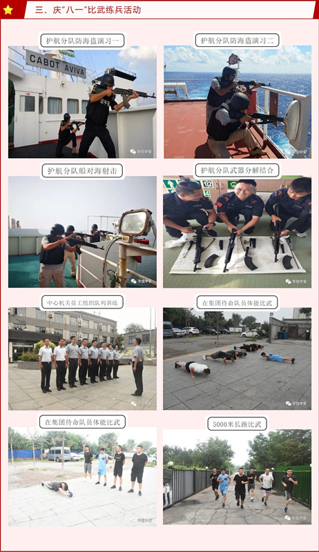 乐鱼体育党委为充分发挥思想政治工作在保安基层组织的作用,真正做到了保安业务延伸到哪里,党组织就建到哪里。公司始终把政治素质作为考察、管理海外武装护航队员的第一要素,坚持强化党对护航队伍的领导。海外党支部针对国外工作的特殊性,结合党员高度分散的特点,建立了QQ群、微信群,通过网络传达上级指示精神,组织党员学习,党员也定期向党组织汇报本人的思想和在国外工作的情况。海外党支部通过发挥党员先锋模范带头作用,带动全体护航队员牢记国格、军格、司格、人格,打造高素质、高品质的护航队伍,树立中国武装保安的品牌,让外国同行看到我们退伍军人及共产党员不同凡响的正面形象。今年"八一"建军节来临之际,海外党支部开展了一系列特色活动。