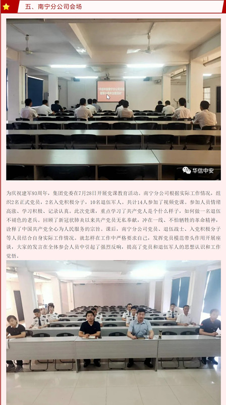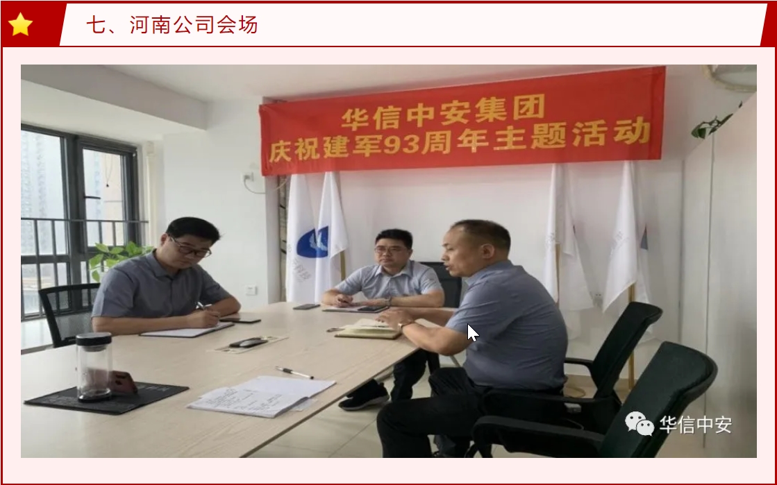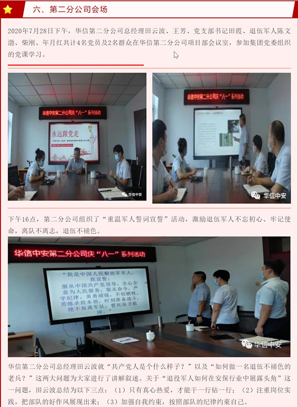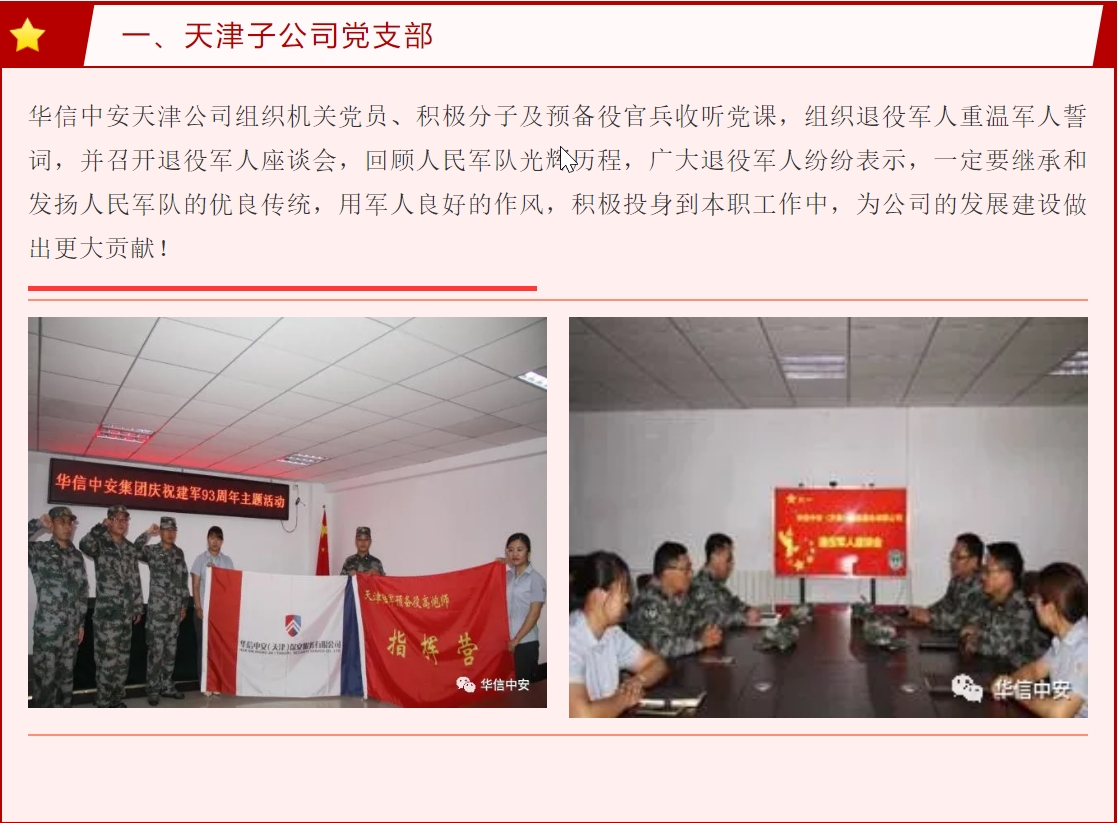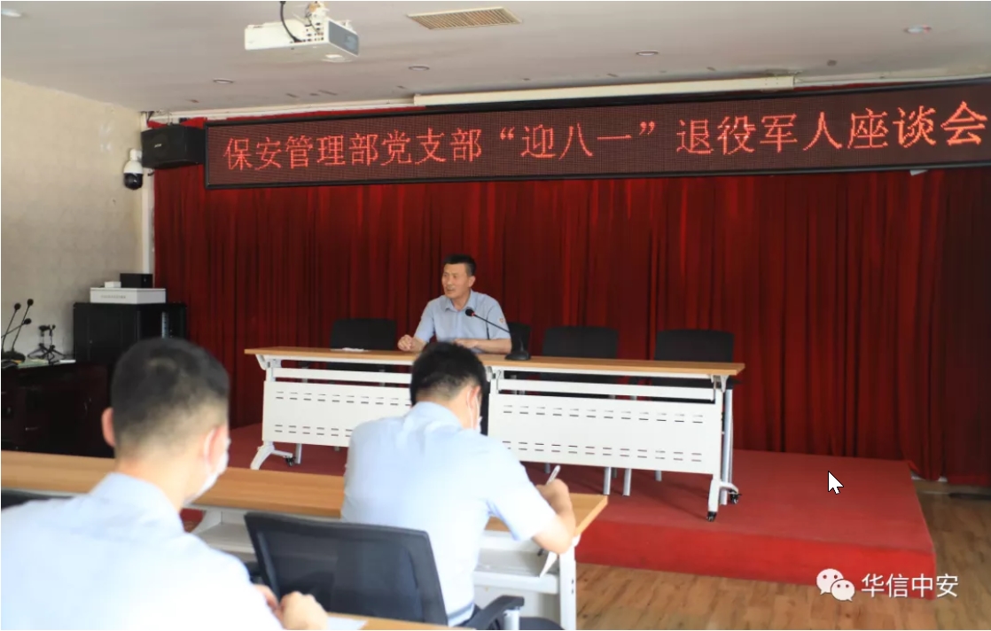 7月28日下午,机关党支部组织退役军人座谈,大家回顾军队的经历和退伍走向社会后的落差,畅谈来到华信中安的感受,展望公司和个人的未来。