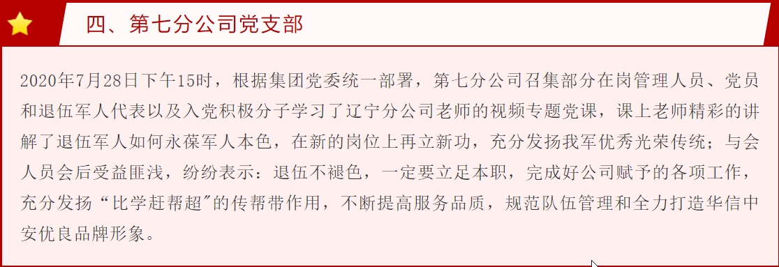 7月28日下午乐鱼体育在辽宁子公司设置主会场,开展了以《明晰共产党人的样子,做退伍不褪色的合格老兵》为主题的党课教育,其它党支部、子公司、分公司、事业部以视频会议的形式集中组织听课。