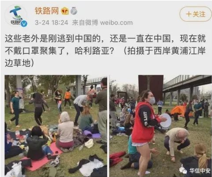 无独有偶3月24日,铁路网官博曝光了一群外国人,在上海黄浦江附近不戴口罩聚会。