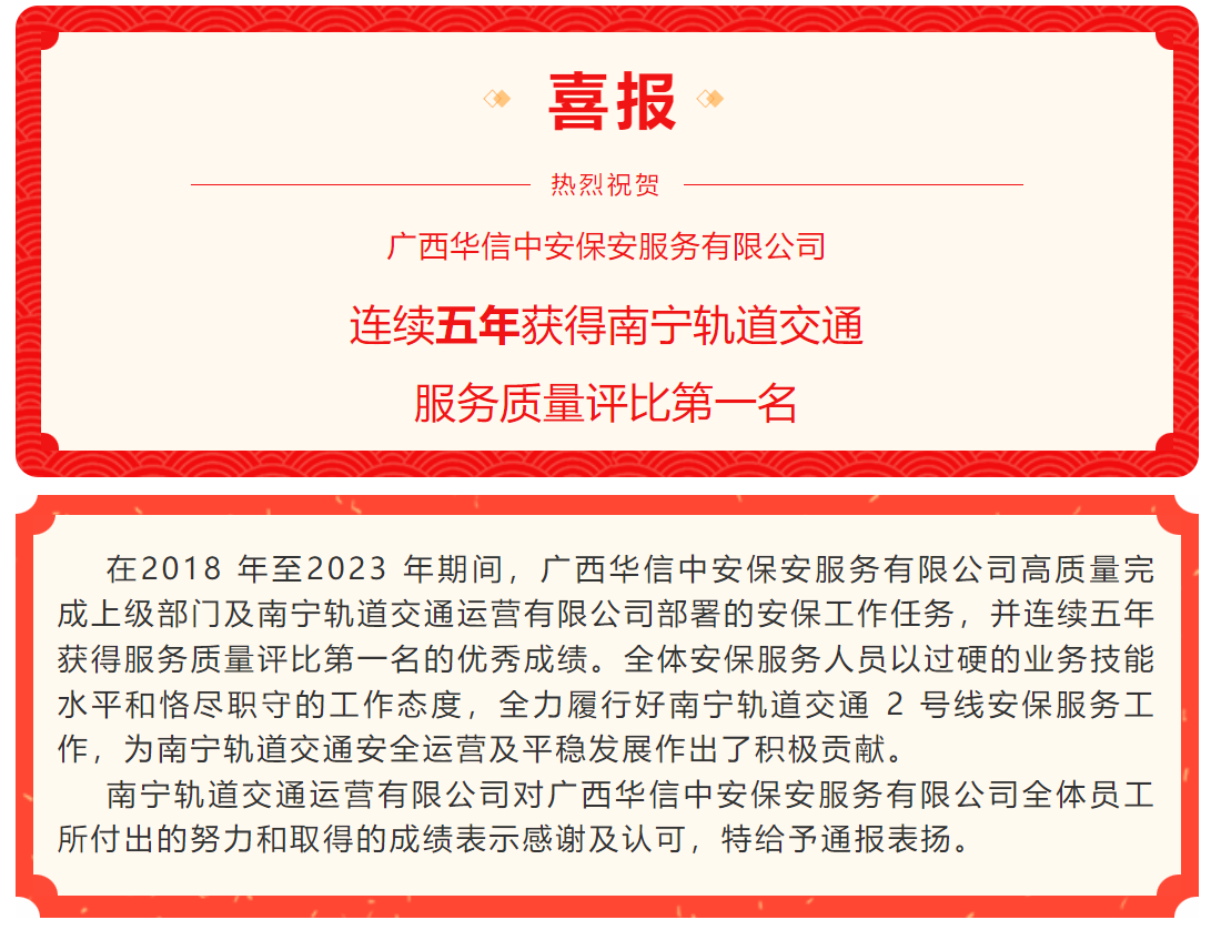 自2018年至今,广西华信中安保安服务有限公司连续五年在南宁轨道交通运营有限公司组织的服务质量评比中获得第一名的佳绩。荣誉的取得既是鞭策也是激励,未来广西华信中安保安服务有限公司将一如既往积极响应业主单位号召,共同践行“打造精益运营、成就美好出行”的运营使命,持续做好南宁轨道交通运营安保服务工作,树立南宁轨道交通优质安保形象,成为南宁轨道“城市形象新名片、城轨服务新典范”愿景的重要参与者和积极贡献者。