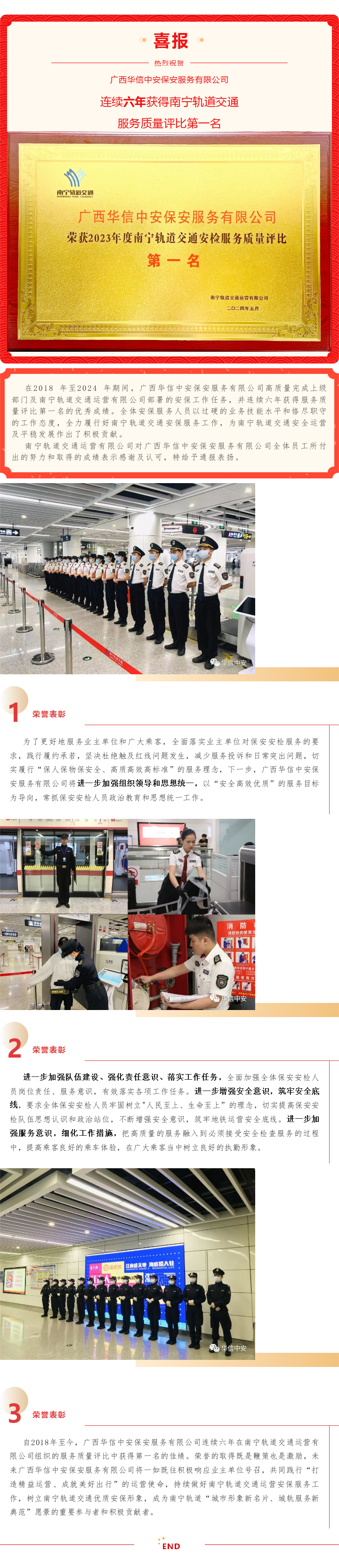 【喜报】广西华信中安保安服务有限公司连续六年获得南宁轨道交通服务质量评比第一名优秀成绩